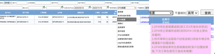 当SMT 部门主管打开自己部门的“运作与异常管理平台”,SMT单位中有多个作业类别,诸如首件检查,钢板&载具管理等,巡检,DFM提报等各项程序在下拉式菜单中呈现。这种集中式的程序汇集,减少了执行人员与管理人才分别逐步逐级打开单支程序的时间,同时也有利于防止遗漏,让工作执行的更全面彻底。